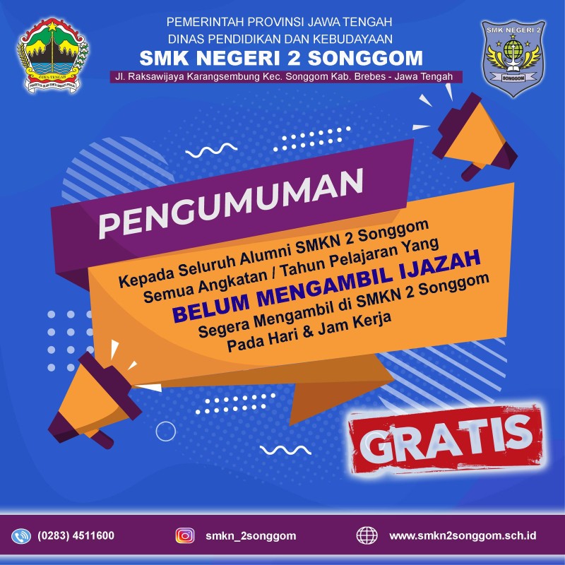 Pengumuman bagi seluruh Alumni SMK Negeri 2 Songgom Semua Angkatan / Tahun Pelajaran yang belum mengambil Ijazah Segera mengambil Ijazah di SMK Negeri 2 Songgom pada hari dan Jam Kerja.